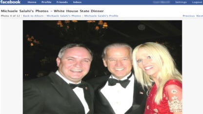 The wife is question is named Michaele Salahi, pictured above with current-prez then-veep Biden, taken on some shitty digital camera she also snuck in and posted to Facebook.
